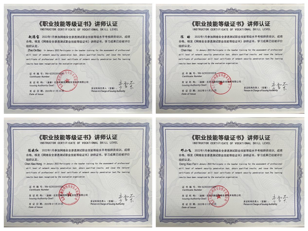 教育部第四批1+X证书《网络安全渗透测试职业技能等级证书》师资培训班于2022年1月5日至7日在线上举办。本次培训由网络安全教育行业领军企业、北京天融信教育科技有限公司承办,培训课程包括应用系统渗透测试、操作系统渗透测试、网络设备渗透测试、安全巡检、网络服务器安全巡检、安全加固、应急响应等内容。信创学院组织教师参加培训学习,最终有12人顺利通过考核并获得讲师认证。