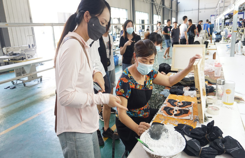 学员参观鞋面生产车间与员工交流