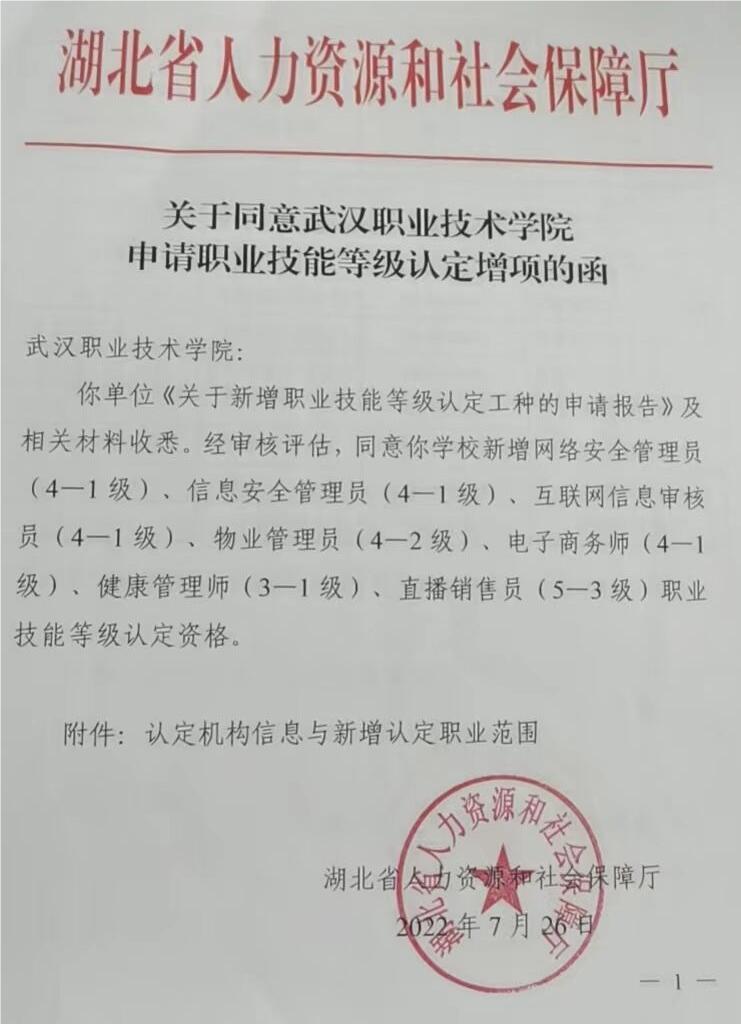 武职网讯(通讯员 李静)近日,经湖北省职业技能鉴定指导中心专家组现场评定、省人社厅审批、人社部备案,学校成功增项备案网络与信息安全管理员、物业管理员、健康管理师、直播营销员、电子商务师5个职业(工种)技能等级认定资格。至此,学校职业技能等级认定范围扩大为78项,认定级别全覆盖。