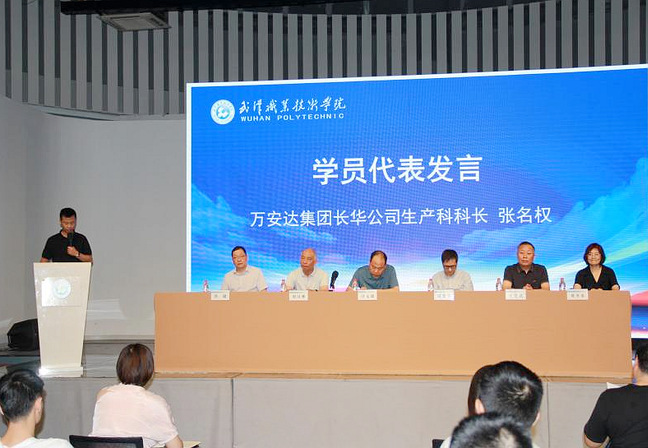 武职网讯(通讯员 汪春莲)6月26日,纺织与服装工程学院(以下简称“纺服学院”)服装技术管理骨干培训班开班仪式在凌曦楼服装表演厅举行。武汉职业技术学院副校长刁元斌、湖南万安达集团常务副总经理赵建华出席并致辞。万安达集团生产部部长刘汉林、万安达集团永达实业总经理王宽武、万安达集团涔澹实业副总经理洪健、万安达集团13家单位50名学员出席。开班典礼由纺服学院党委书记、院长戴冬秀主持。
