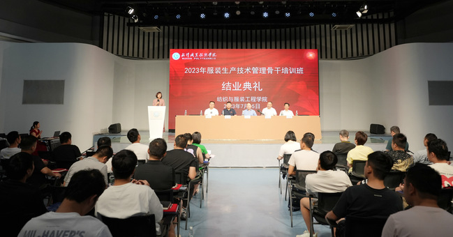 武职网讯(通讯员 汪春莲)7月15日,2023年服装生产技术管理骨干培训班结业典礼在纺织与服装工程学院(以下简称“纺服学院”)服装表演厅举行,圆满完成培训学习任务的50名学员参加结业典礼。